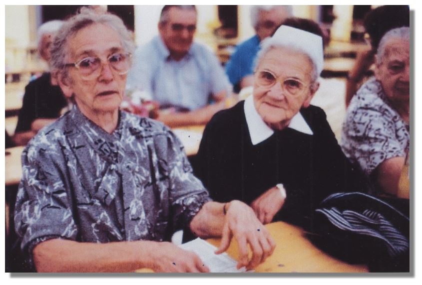 | Bild von Schwester Auguste, die viel zu Ottos Genesung nach seiner Gefangenschaft beitrug. Sie zog nach ihrer Pensionierung wieder zurück in ihren Geburtort Hundheim. Das Foto stammt von einer Feier in Hundheim, links daneben ist die Cousine von Ottos Mutter, Erna Lahm, die über 100 Jahre alt wurde. |