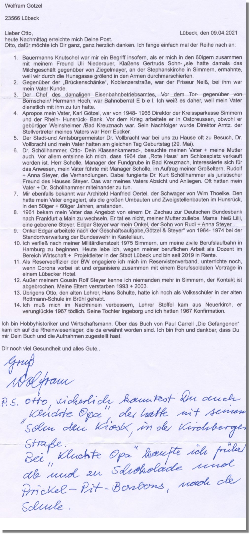 Brief von Wolfram Götzel aus Lübeck, der aus Simmern stammt.