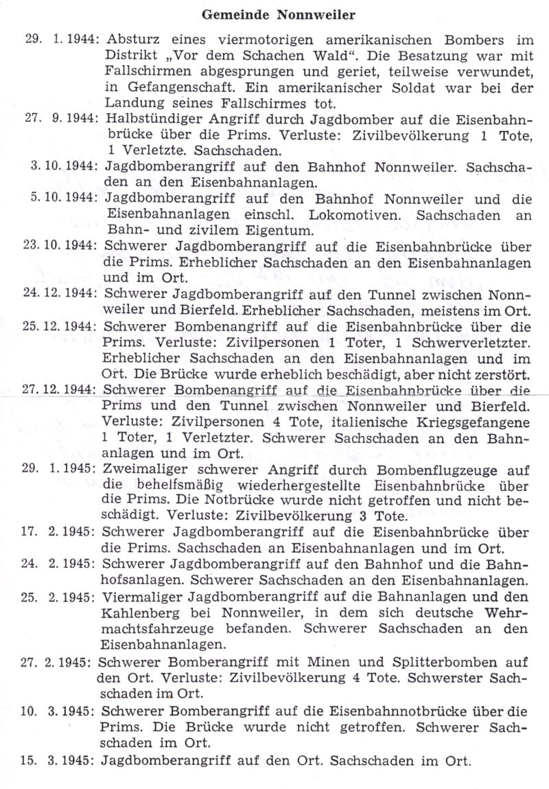 Vielen Dank an Herrn Roth für die Zusendung der Bilder von der Brücke und von der Höckerlinie, sowie die Zeittafel der Kriegsereignisse der Gemeinde Nonnweiler in den Jahren 1944/45 ]