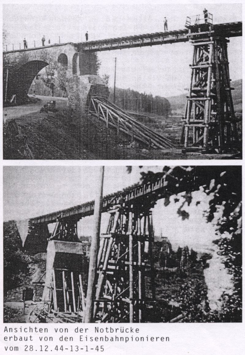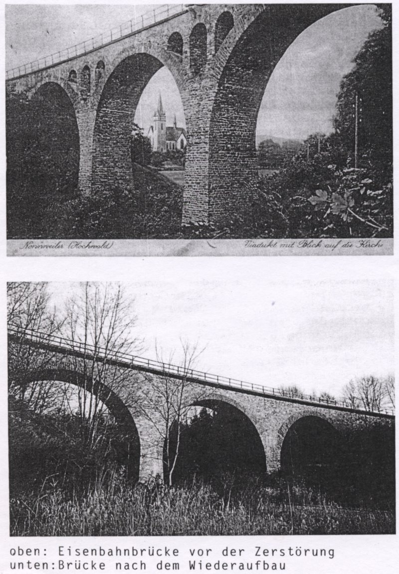 [Anmerkung Otto Berg: Die folgenden Bilder zeigen die Eisenbahnbrücke von Nonnweiler vor und nach der Zerstörung. Direkt daneben hatten wir, wie im Buch zu lesen ist, unser Quartier bis zum 23.12.1944 aufgeschlagen. Am 25.12. wurden das Haus und die Brücke von Bomben getroffen und schwer beschädigt. Außer uns wohnte niemand mehr in dem Haus, da alle evakuiert waren. Auch sonst waren nur noch wenige Leute in der Nähe der Brücke.